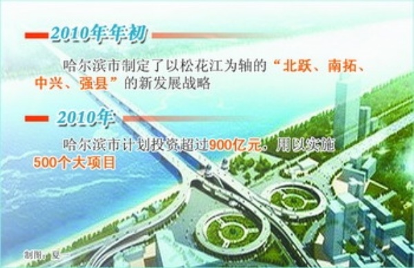 哈尔滨最有特色的就是松花江。我们的构想是,“北跃”着力发展高科技产业,“南拓”建设新型工业化产业基地,“中兴”使中心城区面貌尽快改善、服务业提档升级,“强县”要让县域经济上到一个新水平,从而实现“一江居中、两岸繁荣”。这个战略的实施,正是一个经济结构大调整、发展方式大转变的过程。