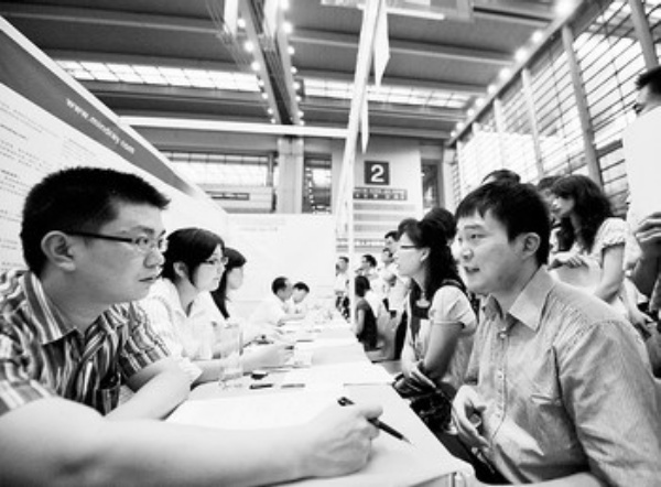 5月22日,求职者(右)在与企业招聘人员面谈。 当日,由深圳市鹏程人力资源配置有限公司主办的第41届“群英会”————深圳中高级人才招聘会在深圳会展中心2号馆举行。本次招聘会有360家企业参加,其中30多家为世界500强企业,共提供1.6万个中高级岗位,吸引了1.68万人进场求职。 新华社记者 陈晔华摄