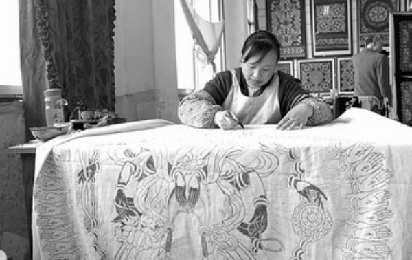 为了让蜡染适应国画的风格,王 潜心钻研,掌握了一种独特的蜡染工艺,独特体现在冰纹的处理上:“这种工艺能让我自由掌握冰纹形成的位置,因为我的画以人物居多,这种蜡染的方法可以避免在人物的面部出现冰纹,而人物的衣着却可以任意控制形成自然冰纹。”可谓一项巧夺天工的创作。