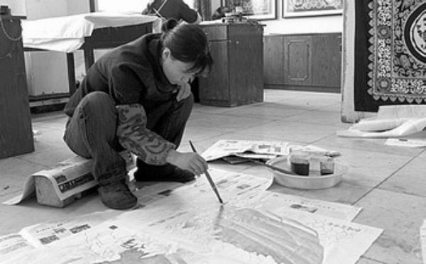 为什么作画时一定要用铜刀而不是毛笔呢?在洪福远的工作室里,正有两位工人忙着前期准备工作,他们把蜂蜡放在一个金属罐里,用火盆里的木炭灰帮助蜡融化,“因为用毛笔蘸蜡容易冷却凝固,而铜刀则便于保温。”这种铜刀是用两片或多片形状相同的薄铜片组成,一端缚在木柄上,刀口微开而中间略空,工人说,这样便于蘸蓄蜂蜡。