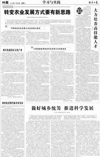 近年来,河南省围绕加快农业发展方式转变,千方百计稳定粮食生产,加快构建现代农业产业体系,着力统筹工农业发展,大力深化体制机制创新,取得了显著成效,尤其是在应对国际金融危机冲击和严重自然灾害中,保持了农业农村发展的良好态势,为经济平稳较快发展提供了基础支撑。