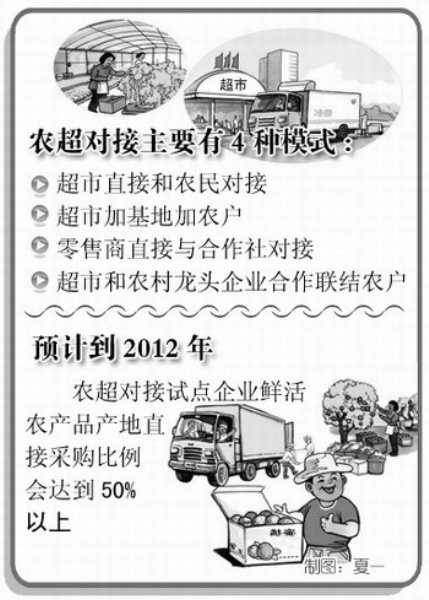 自2008年农超对接试点工作启动以来,农超对接已经取得了一定的积极成效。农超对接能突破传统农产品供应链上众多中间流通环节的阻碍,使超市直接与农民合作。预计到2012年,农超对接试点企业鲜活农产品产地直接采购比例将达到50%以上,这将在提高农民收入的同时,给消费者带来更大的实惠。