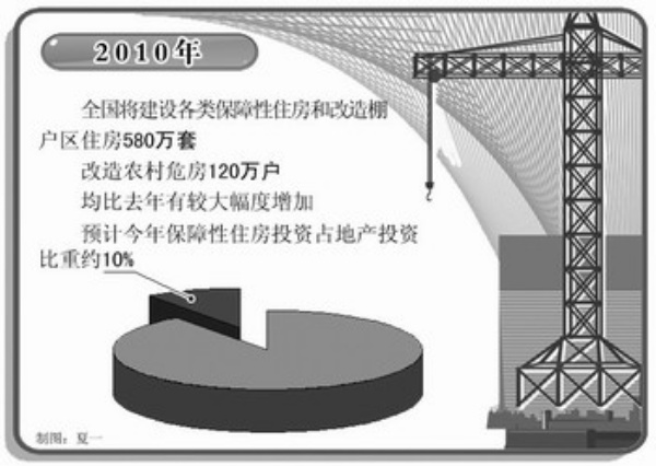 住房和城乡建设部日前与各地方政府签订了2010年住房保障工作目标责任书,要求各地方政府确保完成2010年工作任务。按照要求,2010年全国将建设各类保障性住房和改造棚户区住房580万套,改造农村危房120万户,均比去年有较大幅度增加。