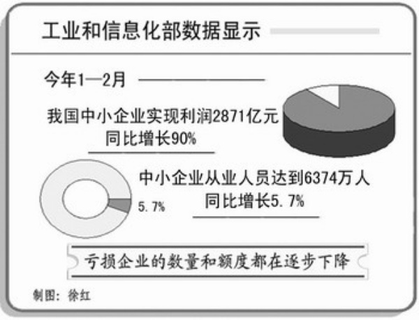 随着我国经济形势特别是工业经济的回升,我国中小企业发展也继续保持了稳步回升的态势。工信部提供的数据显示,中小企业的经济效益实现了较快回升,今年前两个月,我国中小企业实现利润2871亿元,同比增长90%,亏损企业的数量和额度都在逐步下降。