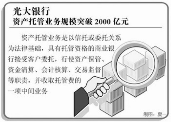 本报讯 记者赵晓强报道:近日记者从光大银行获悉,截至3月31日,该行资产托管业务规模达到2074.94亿元,突破2000亿元大关,年均业务增长率超过100%,跃居股份制商业银行前列。
