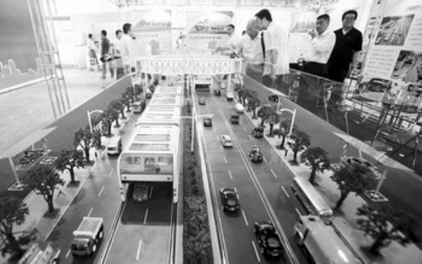 5月27日,观众在第十三届中国北京国际科技产业博览会现场观看一种新型零排放公交立体快巴模型。 本报记者 赵 晶摄