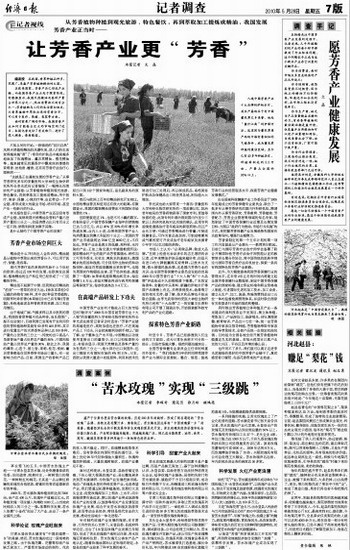 甘肃永登县苦水镇享有“中国玫瑰第一乡”的美誉。然而,苦水玫瑰却走过一段艰难的发展之路。由于玫瑰花瓣、花蕾等初级产品缺乏深加工,严重受市场波动的制约,花农的收入很不稳定。同时,玫瑰精油提取技术落后,没有取得走向国际市场的通行证,导致上世纪90年代初玫瑰油大量积压,玫瑰种植面积锐减,大量玫瑰树被砍,玫瑰产业裹足不前。