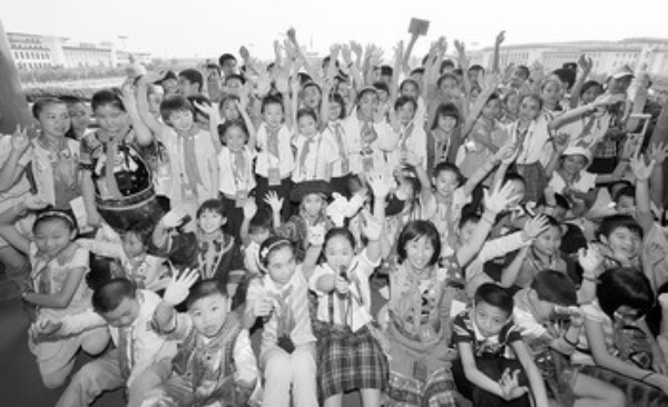 5月31日,登上天安门城楼参观的小代表在城楼上合影留念。当日,参加中国少年先锋队第六次全国代表大会的85名小代表来到天安门城楼参观。 新华社记者 杨 光摄