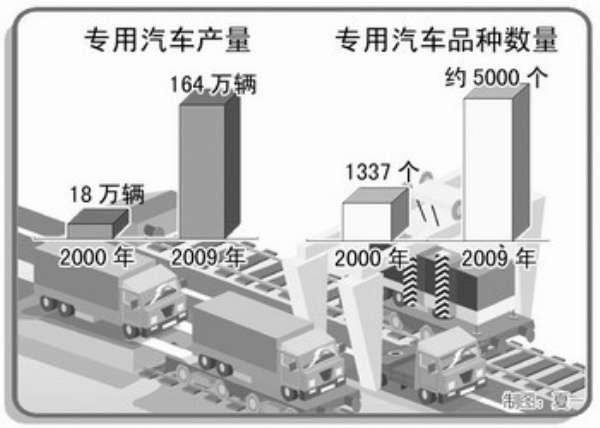 伴随着我国汽车市场的繁荣,专用汽车产业也进入了快速发展时期。在过去的近十年时间里,中国专用汽车年产量从18万辆增至164万辆。专用汽车产品的品种也由2000年的1337个快速增长到现在约5000个。截至2009年12月,全国专用汽车生产企业已经达到826家。