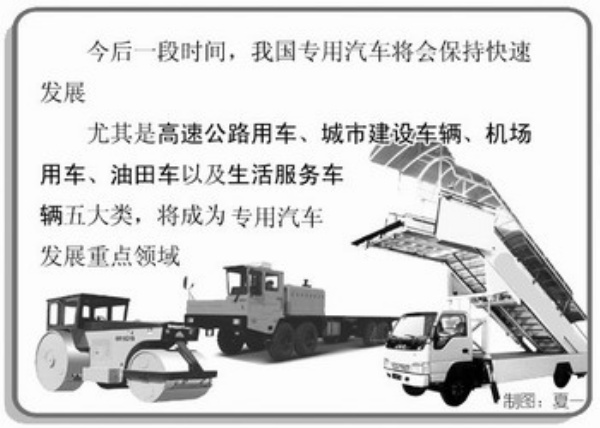 日前,在2010中国专用汽车产业发展国际论坛上,中国汽车工业协会专用车分会理事长王焕民表示,今后一段时间,我国专用汽车将会保持快速发展,尤其是高速公路用车、城市建设车辆、机场用车、油田车以及生活服务车辆五大类,将成为我国专用汽车发展重点领域。