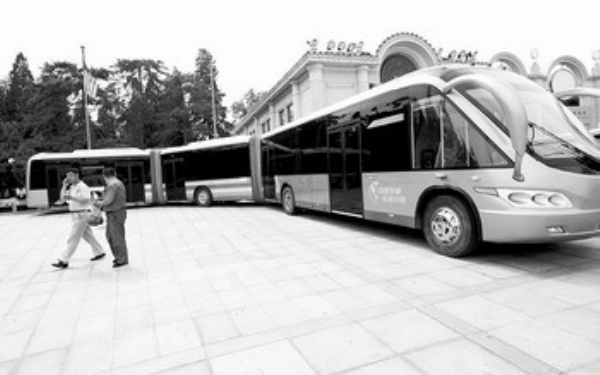 | 5月26日,观众从宇通BRT公交车前走过。这款超长公交车长25米,最大载客量230人。当日,第十届中国国际交通技术与设备展览会开幕。 新华社记者 金良快摄 |