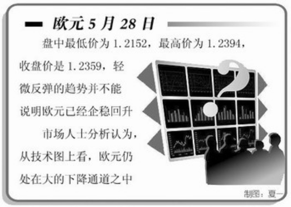 欧元5月28日盘中最低价为1.2152,最高价为1.2394,收盘价是1.2359,轻微反弹的趋势并不能说明欧元已经企稳回升。市场人士分析认为,从技术图上看,欧元仍处在大的下降通道之中。