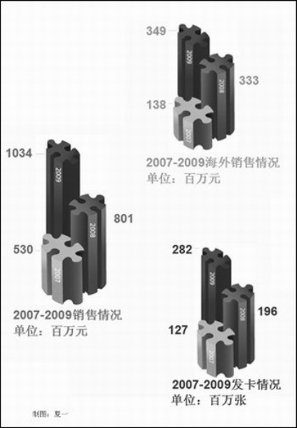 2007年—2009年,握奇的销售收入分别为:5.3亿元、8.01亿元、10.34亿元。公司高级副总裁、信息安全与密码学博士高翔告诉记者,“握奇是一个典型的哑铃结构的公司。即一头是研发,另一头是市场,中间的加工制造外包出去。根据市场需求来加大研发力度,这是握奇的安身立命之本。”