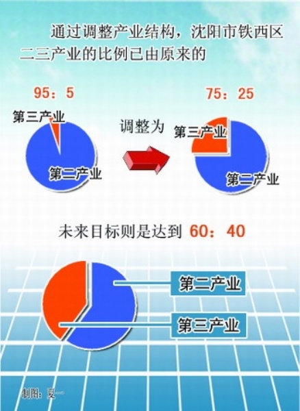 事实上,城市功能转型的过程也正是产业结构调整的过程。记者了解到,在铁西区,二三产业的比例已由原来的95:5,调整到了现在的75:25,“我们的目标是达到60:40的比例。”董峰介绍说,目前,铁西区调整产业结构的重点落在生产性服务业的突破和第二产业内部的结构调整上。