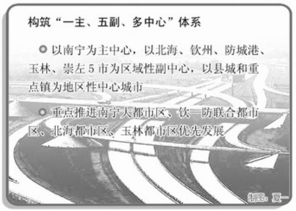 《纲要》提出,总体上要将广西北部湾城镇群建设成为具有国际影响力和竞争力的特色城镇群、科学发展示范区、我国与东盟开展区域合作的大舞台。在具体发展思路上,《纲要》提出,要构筑“南宁+沿海”发展双极、“南宁—滨海城镇发展主轴”,提升区域新功能的“玉崇发展走廊”,形成“双极、一轴、一走廊”的空间发展结构。以大范围生态自然景观为背景,以网络化、开放式的交通体系为骨架,以区域经济联系主要方向为依托,以核心城市为中枢,构筑多中心、多层次城镇体系。同时,构筑“一主、五副、多中心”体系,以南宁为主中心,以北海、钦州、防城港、玉林、崇左5市为区域性副中心,以县城和重点镇为地区性中心城市,重点推进南宁大都市区、钦—防联合都市区、北海都市区、玉林都市区优先发展。