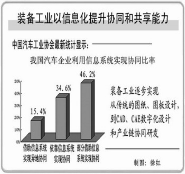 值得关注的是,在产品协同开发方面,信息化也发挥了很大作用。调查显示,目前,有15.4%的汽车企业借助信息系统实现了异地协同,34.6%的企业主要依靠信息系统实现协同,46.2%的企业部分借助信息系统实现协同。