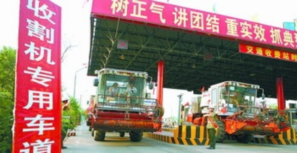 左图 6月1日,“麦客”驾驶着联合收割机,通过107国道内丘收费站设置的“收割机专用车道”。近日,河北省邢台市交通部门在107国道开辟“收割机专用车道”,确保“麦客”顺利过境南下参加麦收。