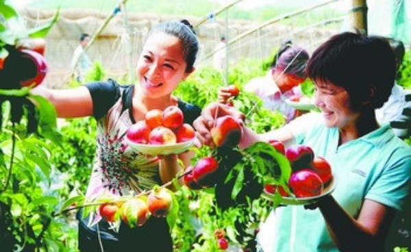4日,河北省迁安市大五里乡张家峪村农民正在采摘油桃。近年来,该市加大农业投入,实施农业开发项目过千项,带动农民人均增收2000余元。 本报记者 李景录摄
