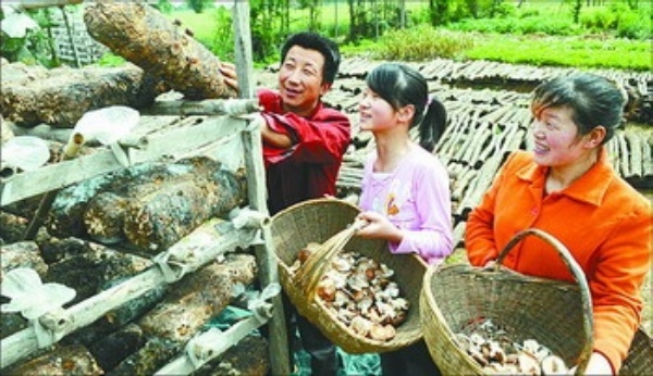 | 随州市三里岗镇吉祥寺村村民汪福军(右一)一家种植香菇增产又增收。随州是全国闻名的香菇之乡,全市50余家食用菌加工企业,年产值20亿元,年出口创汇1.2亿美元。 |