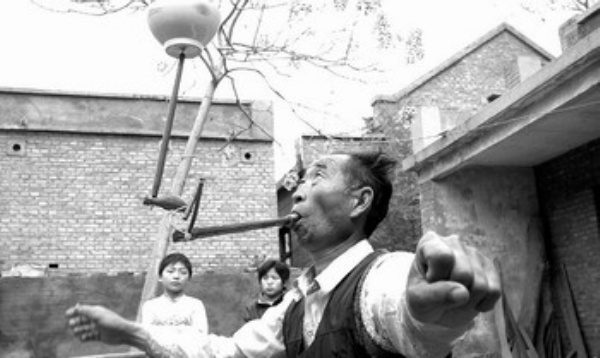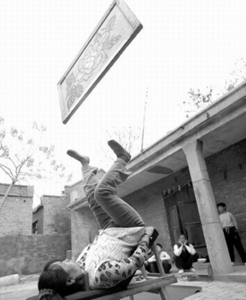 和她有姻亲关系的刘自义学的是更加难练的硬气功。运气之后,他当场为我们表演了用锋利的铡刀在肚皮上切筷子。配合他表演的一位村民指指旁边的大石板抱歉地说:“他还可以把大石放在肚子上演千斤大力士,不过今天帮忙的人太少,抬不起来。”