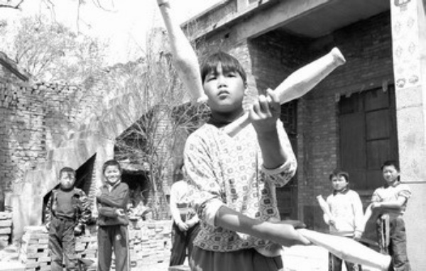 村上人大都是从小就开始练杂技。用村里老人刘进奎的话说:“唱戏村的小孩出门唱戏,玩把戏村的小孩出门打跟斗。这就是‘门里出身,自会三分’。”远离高科技的舞台技术,没有华美的道具陪衬,我们眼中新奇惊险的杂技对他们来说就像吃饭喝水一样自然。