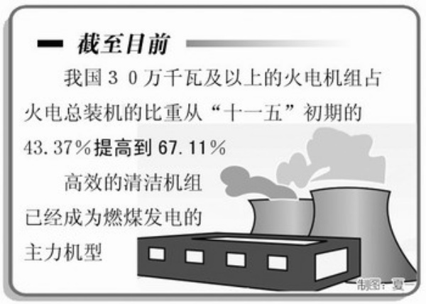 “截至目前,我国30万千瓦及以上的火电机组占火电总装机的比重从‘十一五’初期的43.37%提高到67.11%,高效的清洁机组已经成为燃煤发电的主力,电力结构得到进一步优化”