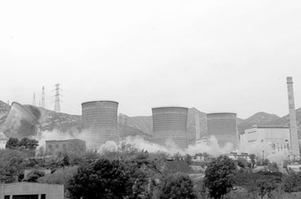 “倒计时10、9、8……1,爆破!”随着倒计时的结束,曾经在朝阳发电厂运行近40年的冷却水塔轰然倒下。