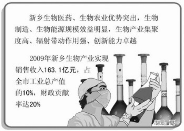 本报讯 记者王伟、通讯员董文胜报道:近年来河南省新乡市生物产业发展迅速,优势明显,已初步形成涵盖生物医药、生物农业等多个领域,产业链相对完整的特色产业集群,行业规模占全省四分之一以上。华兰生物、拓新生化、新谊医药等3家企业被新认定为国家高新技术企业;同时,华兰生物被确定为国家创新型试点企业。目前新乡产值超亿元的医药企业有10家,2009年全市生物产业实现销售收入163.1亿元,占全市工业总产值的10%,财政贡献率达20%。
