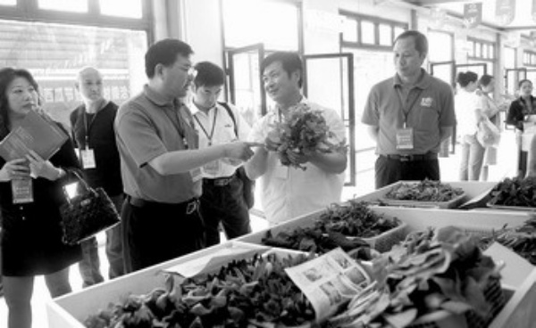 5月31日,北京大兴区庞各庄镇农产品配送中心,农民为超市和餐饮企业代表介绍新鲜蔬菜。当天,农业部信息中心、北京市商委、北京市农委、大兴区政府共同举办了农超对接洽谈会。通过接洽,大兴农产品基地每天把新鲜瓜果蔬菜直接送进市区各大超市,减少了流通环节和成本,既增加了农民收入,又降低了超市采购成本,消费者能以更优惠的价格购买到新鲜优质的农产品。