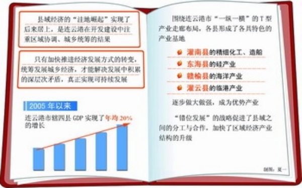 为推动县域经济发展,连云港坚持统筹城乡的思路,整体规划,科学布局。连云港市发改委副主任谭树林认为,县域经济的快速崛起,得益于着眼全局、统筹城乡的产业布局,县域经济被置于区域经济整体的大盘子之中,有效整合了城市、港口、县域资源,实现“点”、“链”结合,“点”就是县域,“链”就是沿海产业带,二者结合构成经济发展板块,成为全市新的经济增长点。与此同时,随着江苏沿海开发战略的实施,为发展县域经济营造了良好的政策环境,县域经济进入了发展的快车道。