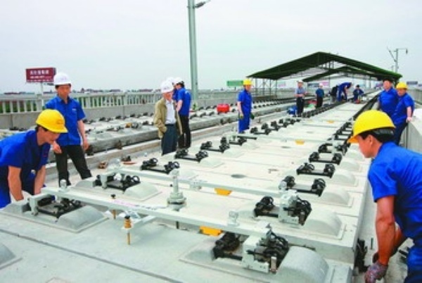 6月8日,沪杭铁路客运专线的建设者在工地进行无砟轨道施工精调作业。目前,沪杭铁路客运专线无砟轨道施工进入最后冲刺阶段,铺轨作业即将展开。 徐云华摄 (新华社发)