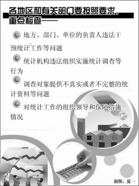 这次检查的内容涵盖了统计工作的各个方面、各个环节。根据检查对象的不同,大检查明确了不同的重点。各地区和有关部门要按照要求,重点检查地方、部门、单位的负责人违法干预统计工作、打击报复统计人员等问题,重点检查统计机构违法组织实施统计调查、在统计上弄虚作假等行为,重点检查调查对象提供不真实或者不完整的统计资料,拒报统计资料等问题,重点检查对统计工作的组织领导和保障措施情况。