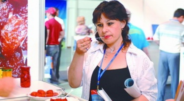 6月7日,一名哈萨克斯坦客商在品尝中国产的水果罐头。 当天,第八届哈萨克斯坦—中国商品展览会在阿拉木图“阿塔肯特”展览中心开幕。来自中国的约230个展商亮相本届展览会,涉及领域包括机械、化工、建材、服装、食品、电器等。 新华社记者赵 宇摄