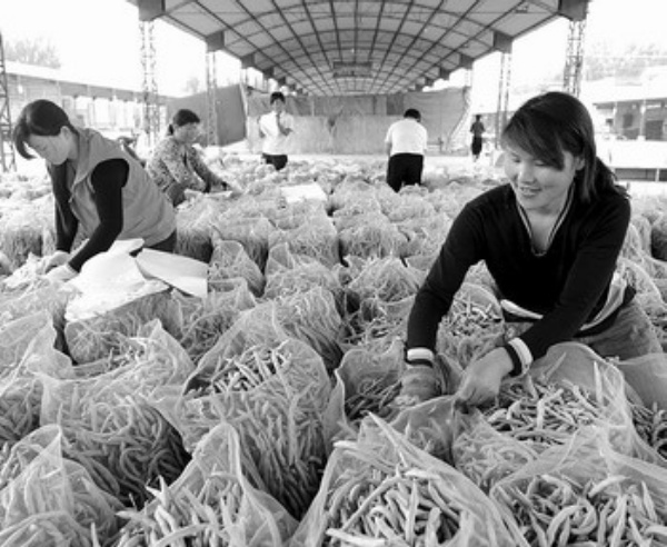 “中国芸豆之乡”山东枣庄市峄城区3万亩芸豆近日上市,目前日上市量20余万公斤。这是峄城区大桥蔬菜批发市场的商户在装包外运芸豆。 孙启路摄