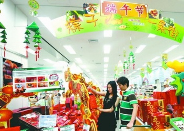 6月14日,北京十里堡华堂商场,顾客在挑选特色香粽。临近端午节,包装精美、口味多样的粽子在京城各大商场、超市热卖,受到消费者的喜爱。 本报记者 赵 晶摄