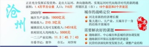 得知记者来作转变经济发展方式调研采访,沧州市委书记郭华应约与我们进行了座谈。他告诉记者,黄沙浊浪、水咸地碱、贫困落后,这是沧州过去的真实写照。近年来,通过深入学习实践科学发展观,沧州人民对转变发展方式有了新的认识,奋发创业积极进取精神已经迸发,全市经济有了长足发展,人民生活水平有了较大的提高。2002年,沧州市地区生产总值仅531.3亿元,到2009年,全市实现生产总值1900亿元,连续5年居全省第四,同比增长11.3%,增速居全省第一;全社会固定资产投资1102.8亿元,同比增长39.17%;财政收入210.3亿元,同比增长33.7%,增速全省第一;城镇居民人均可支配收入14518元,同比增长10.2%;农村居民人均纯收入5000元,同比增长10%。6个国家级和1个省级贫困县的财政收入都超亿元。
