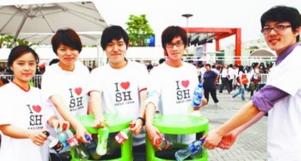 几位大学生志愿者将捡拾来的空饮料瓶放进垃圾桶,并向游客宣传“低塑”的理念。