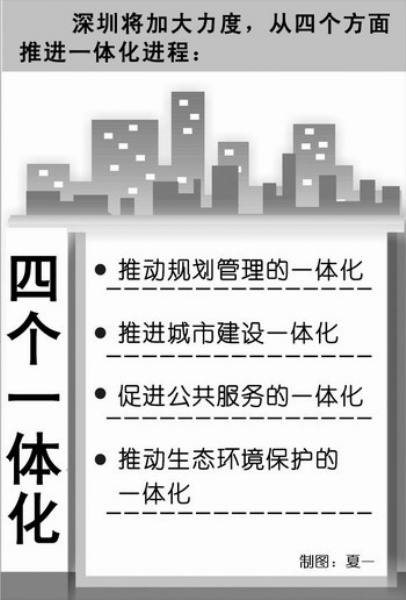 深圳市委常委、副市长吕锐锋在日前召开的深圳两会上谈及特区内外一体化时表示,深圳经济特区扩大到全市后,谋求整个特区的全面协调和谐发展,要统一全市规划和建设,在功能布局、城市建设等方面实行一个标准。