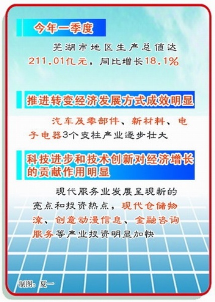 本报讯 记者白海星报道:安徽省芜湖市乘皖江城市带承接产业转移示范区规划的实施,不断加快转变经济发展方式步伐,已成为安徽承接东部地区产业转移的先行地区。今年一季度,芜湖市地区生产总值达211.01亿元,同比增长18.1%。