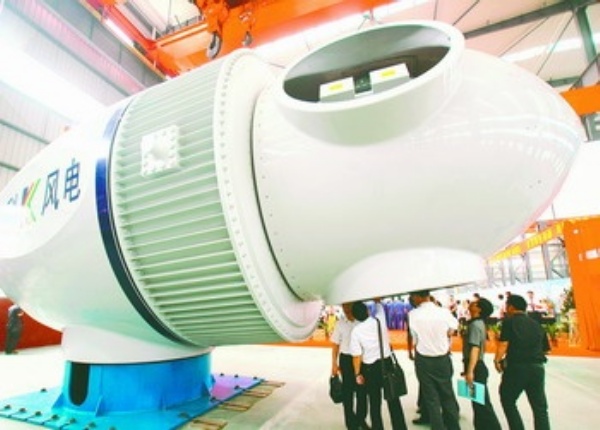 6月18日,参观者在山东聊城山东鲁科风电设备有限公司组装车间观看3.6兆瓦海陆两用直驱风力发电机。 当日,由山东鲁科风电设备有限公司研发制造的3.6兆瓦直驱风力发电机组在山东聊城组装下线。该发电机组应用了独创新技术,可以实现海陆两用和在3600米高海拔运行。 朱玉东摄(新华社
