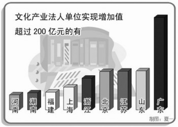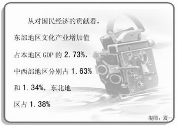 分经济地域看,东部地区的法人单位数量占全国的59%,从业人员数占67%,拥有资产占75%,营业收入占78%,增加值占69%。从对国民经济的贡献看,东部地区文化产业增加值占本地区GDP的2.73%,中西部地区分别仅占1.63%和1.34%,东北地区占1.38%。