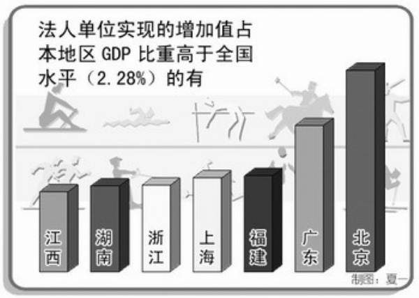 法人单位实现的增加值占本地区GDP比重高于全国水平(2.28%)的有北京(5.77%)、广东(4.20%)、福建(2.74%)、上海(2.69%)、浙江(2.47%)、湖南(2.46%)和江西(2.28%)7个省市。