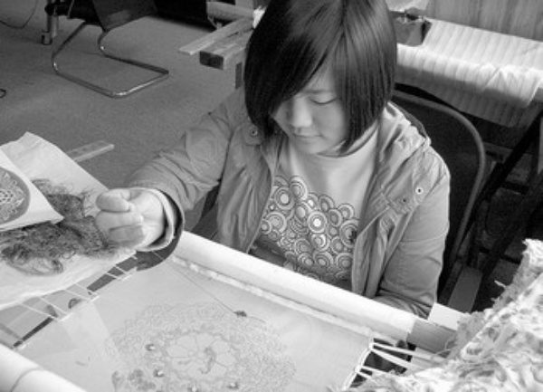张蕾挑出一根与头发丝差不多细的绣花针给记者看,“这是12号的绣花针,还有比这个更细的。只有技术熟练,同时对色彩运用娴熟,才能算一个熟练的绣工。”在张蕾看来,技术熟练才是学习仿真绣的第一步,学生还必须掌握一些绘画的技巧。“仿真绣以人物绣见长,吸收了油画艺术的用光用色,其技艺要求极高,一般绣工很难做到,必须是绣制时间长、精通刺绣工艺、有绘画基础的艺人才能绣制。”张蕾说。