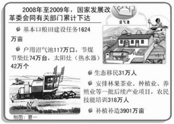 统计显示,2008年至2009年,国家发展改革委会同有关部门累计下达基本口粮田建设任务1624万亩;户用沼气池117万口,节煤节柴灶74万台,太阳灶(热水器)42万个;生态移民31万人;安排林果茶业、种植业、养殖业等一批后续产业项目,农民技能培训318万人;补植补造3901万亩。