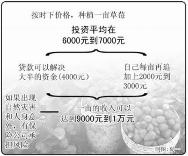 郭同丰给熊怀成算了一笔账,按时下价格,种植1亩草莓的一次性投资大约在六七千元钱,如果第二年再投点资换新膜,草莓能提前一周上市,1亩赚出4000元的利润没有问题。这就是说,贷款可以解决大半的资金,如果自己每亩再追加上2000元到3000元,草莓种植就可以搞起来了。如果出现自然灾害和人身意外,还有保险公司承担风险。