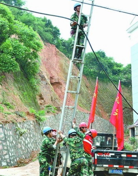 经过4个多小时行驶,记者来到了资溪县县城。资溪县供电公司生产技术部主任高水平正领着抢险突击队登上梯子安装新电线。“昨晚我们接到抢修电路的命令,今天上午6点半就开始工作了,目前县城区域已经全部通电,到了傍晚,住在恒昌星城的600多断电户也能重新用上电。”资溪县供电公司黄乍峰告诉记者。在抢修现场,在印有国家电网标识的抢修车上,两面“抗洪抢险党(团)员突击队”旗帜正迎风招展。