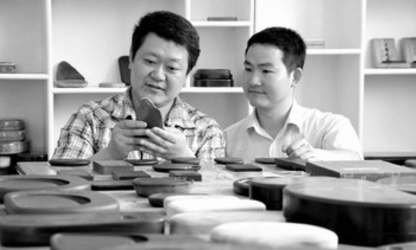 6月3日,在歙县“天方砚谈砚务中心”,安徽省民间文化传承人凌红军(左)在指导学生。