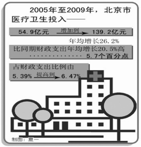 近年来,北京市委、市政府下大力气配合有关部门不断加大医改资金投入。医疗卫生投入从2005年54.9亿元,增长到2009年139.2亿元,年均增长26.2%,比同期财政支出年均增长20.5%高出5.7个百分点,占财政支出比例由2005年的5.39%提高到2009年的6.47%。