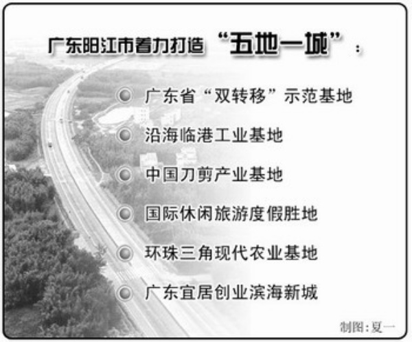 “阳江依山傍海,资源丰富,风景如画,有刀剪等传统产业的基础,还适合发展海洋、旅游、能源经济。这是阳江特有的优势,也是差异化发展的切入点。”阳江市委书记林少春表示,要在发展理念上,强化人均指标,追求绿色崛起、幸福赶超;在发展战略上,坚持三次产业协调发展的新型工业化道路,更加注重经济发展质量和效益;在发展路径上,主动融入珠三角、依托珠三角、服务珠三角。阳江市将发展思路调整完善为“五地一城”:着力打造广东省“双转移”示范基地、沿海临港工业基地、中国刀剪产业基地、国际休闲旅游度假胜地、环珠三角现代农业基地和广东宜居创业滨海新城,建设三次产业协调发展的新型工业化城市。