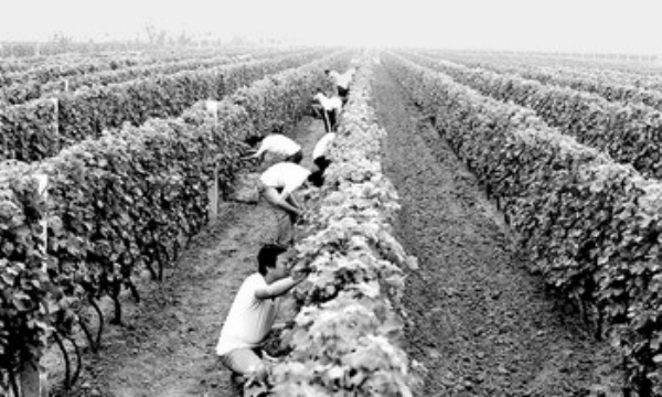 在蓬莱,一条长18公里、总面积2.4万公顷的葡萄长廊已经建成。与此同时,引进新技术、开发新品种的热潮也在广大果农中迅速扩散,仅蓬莱栽培的葡萄品种就达50多个。1999年,烟台中粮在蓬莱建立了葡萄酒生产基地,磕刘二村成为首批基地村,全村200亩地全栽上了酿酒葡萄。农民将地出租给葡萄酒企业,还可参加基地耕作,变成“葡萄车间”里的产业工人,由公司统一提供葡萄种苗、生产物资,统一培训种植技术,并按标准化要求从事生产管理。随着现代管理技术的引入,一户产业工人管理十多亩葡萄园已非难事,年工资收入可达1.5万元。“公司+合作社+农户”的模式实现了农业增效、农民增收。